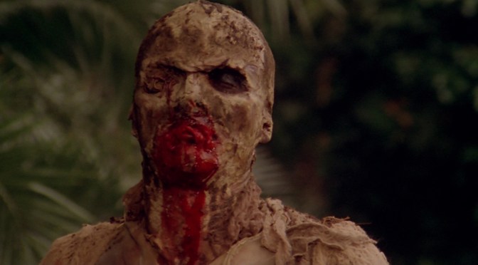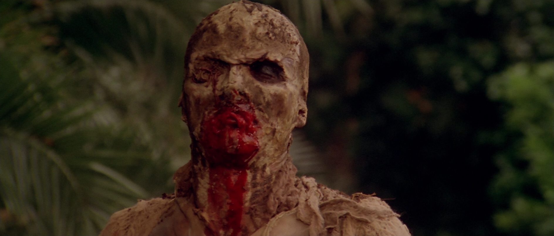 This is an Italian production, so you know what to expect: fast, cheap production; slow pacing; funky music; gore; tits. The movie contains several memorable scenes, including ‘the eyeball gag’ and ‘zombie fights shark’. It’s also notable for its creepy portrayal of the zombies, going for an earthy, decaying, ‘claypot’ look.