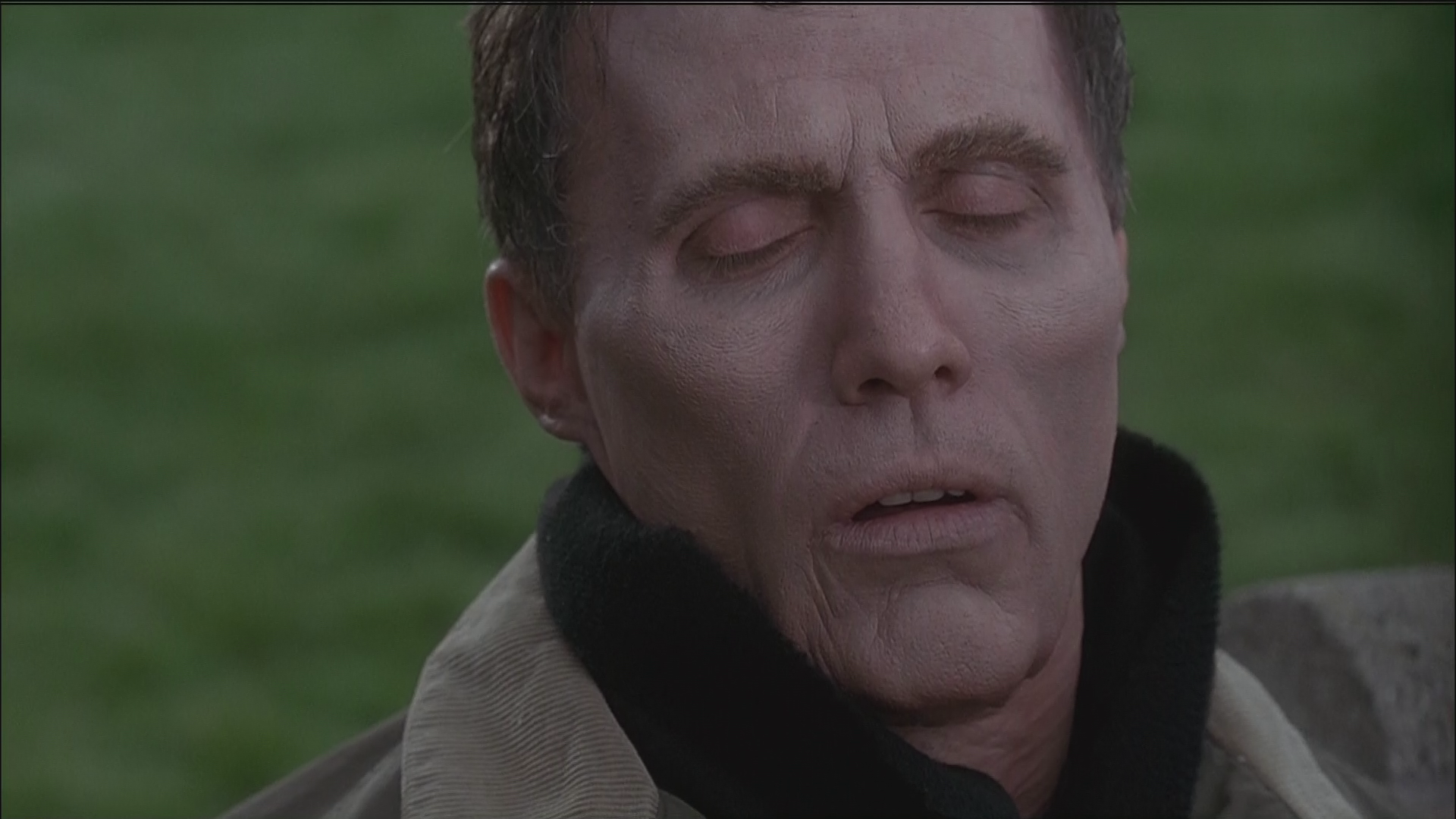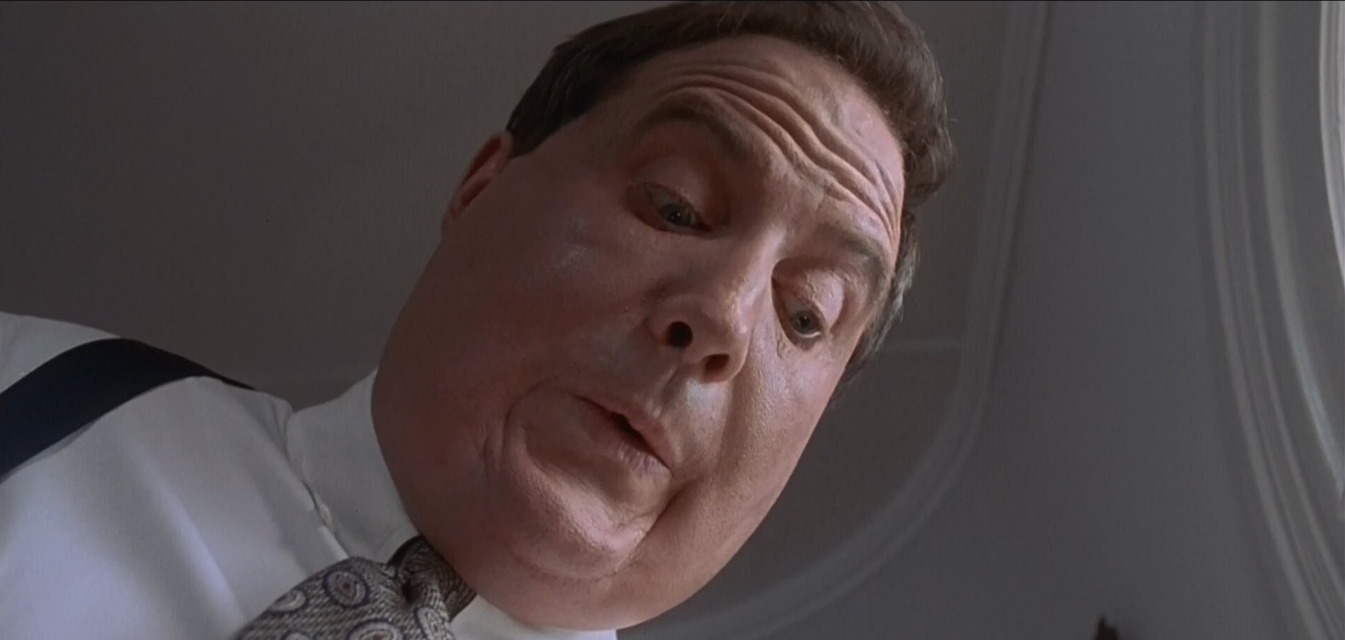 One of the other issues I have with the movie is the make-up. For a movie centered around a heavy-set guy shriveling up to a meager 100 pounds, you’d think the make-up effects would be outstanding. Unfortunately, they’re not. They’re not even “good”, they’re just kinda…okay. I’m not saying it had to be The Nutty Professor (1996)-level good. I mean, for a movie with such a large budget, you’d think they’d be able to achieve something a little more realistic, but the effect they pull off is almost the equivalent of stuffing a pillow under your shirt and tucking your chin into your neck. I remember seeing a special on TV before the movie came out — maybe it was an HBO First Look, I can’t remember now — and it played up how great the make-up was and how important it was to the film. They talked about how Burke lost a bunch of weight prior to filming to make his final transformation even more jarring. But look at that picture above. That’s him in his final stage of “thinner”-ness. That’s as emaciated as he gets in the film. He looks like a normal dude with not-so-subtle shading under his cheekbones. It’s just awful, man.