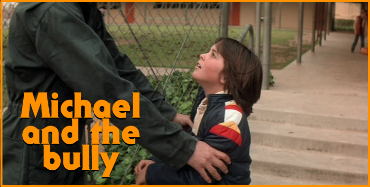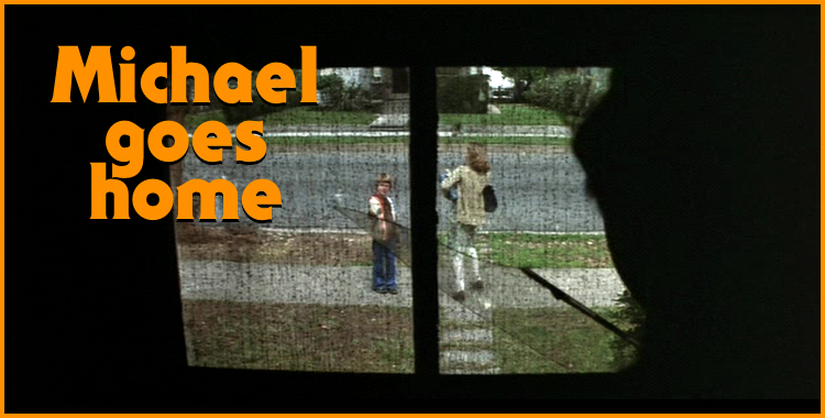 This is such a brief scene, but it comes out of nowhere and offers a truly great jump scare. After Lonnie and company finish bullying Tommy, they scatter (like the cowards they are!) The camera follows one of the bullies when BOOM, he runs smack into Michael Myers. He never sees it coming and neither do we, the audience. Michael stops the kid, grabbing him by the shoulders, the kid staring up in blank-faced terror at Michael’s unseen mask. For a short second, we’re not sure what’s going to happen. We kinda want to see this a-hole kid get handled accordingly. But as soon as it happens, it’s over: Michael slowly releases the bully, and the kid takes of running. Everything about this incredibly brief encounter is so awesome and effectively chilling. It just helps ratchet up the suspense surrounding this mysterious, unseen killer even more.