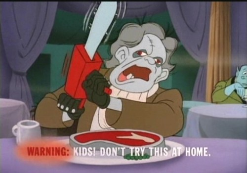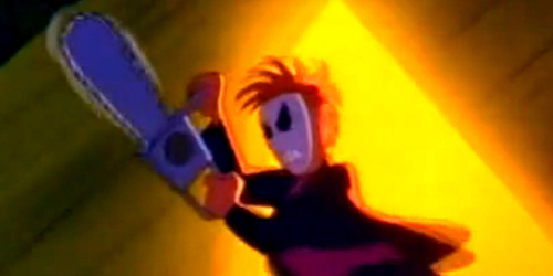 Something that excited me growing up a movie-obsessed kid was seeing film characters and pop culture things referenced in scenarios they weren’t intended for. I can’t explain it, but the discovery of parody and satire had a sublime effect on my developing brain – it showed me that everything kind of exists in the same universe and that anything is possible really. Whether it was Wayne Campbell asking someone at a stoplight if they had any Grey Poupon or Arnold Schwarzenegger as the Terminator popping up in a Tiny Toon Adventures episode, it didn’t matter – it all somehow made sense in this wide, wonderful, referential world of pop culture. And if you understood what they were referencing, it was like you spoke a secret language. To a little kid, learning all this was super thrilling. But what was really exciting and special to me was whenever horror was referenced. As a neo-gorehound, and the only youngster in the tri-state area allowed to watch horror movies whenever he wanted, I felt like catching these little nods was even rarer and more arcane (and therefore more special) than your typical pop reference. And it was always strange yet exciting to me that these bloody, violent, horrific movies were popping up in things intended for younger audiences, like cartoons. Who can forget Leatherface in Daffy Duck’s Quackbusters?