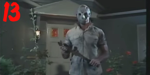 tumblr_inline_njq2shKVZU1qg31ykI’m gonna kick the list off with my favorite Jason inclusion, which may be the most obscure. In 1988, Triaminic (the company that makes cold medicine for kids) released a video cassette called Kid Safe: The Video. The point of the video was to teach kids about what to do and what not to do if they’re ever left home alone. Stuff like don’t drink your parents booze, don’t stick metal items in a toaster, and only call 911 in an emergency. Second City alum Andrea Martin plays the little girl who’s left home alone, and she breaks every rule only to eventually learn her lesson. By the end however, there is one lesson she does abide by: not to answer the door for strangers. As the video wraps up we hear a knock on her door, which she proudly ignores. As she walks away smiling, the camera pans outside – and who do we see knocking at her door? Jason Voorhees! He’s also joined by a martian, a werewolf, a mummy, and a witch. Jason even shrugs and says, “Ah, well…” I had this video as a kid and watched it religiously. I loved it. It also has cameos by Meshach Taylor and Joe Flaherty as his ‘Count Floyd’ character. But what I didn’t realize until recently is that the video was written, produced, and directed by Stuart Gordon! How cool is that? Unfortunately, I no longer have this video in my possession, but thankfully someone just recently uploaded the full thing to Youtube. I highly suggest checking it out if you haven’t seen it!