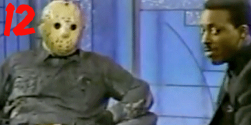 The Arsenio Hall Show. I’ve seen this image brought up many times, so I know it’s alive and well in the hip collective consciousness. But as the child of parents who actually watched Arsenio every night (woof, woof, woof, woof!), I remember this happening in real-time. And I was still young enough to be thinking, “Hey, that’s reallyJason Voorhees on this TV show. The same Jason I’ve seen in all those movies!” Re-watching the clip, hearing how excited the audience is (literally screaming), my appreciation for the early days of burgeoning pop TV soars. I don’t mean to get sentimental, but it was a time before TV was as dumb and jaded as it is now. Having a completely silent guest on a talk show? Just having Arsenio do the talking the whole time? There’s no way they could or would do that now. Nevermind the fact that Arsenio is ‘interviewing’ a fictitious movie character known for slaughtering teenagers instead of an attractive new star promoting their latest film. That was a rare occurrence, one that thankfully lives on through the internet. Major props to Arsenio for pulling that idea off.