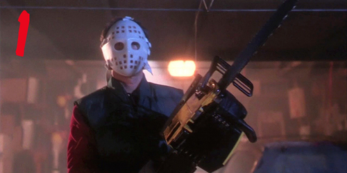 But besides using the actual Jason Voorhees character several times, the first time they referenced the character was in Season 5, in an episode where Bart is being hunted by Sideshow Bob a la Cape Fear. Homer is seen, hockey mask on his face and chainsaw in hand, screaming the memorable line: ”BART-DO-YOU-WANNA-SEE-MY-NEW-CHAINSAW-AND-HOCKEY-MASK?!” What makes this so noteworthy is the fact that it is one of the numerous times pop culture makes reference to Jason by pairing a hockey mask with a chainsaw – despite that fact that (as of this writing) Jason Voorhees has never used a chainsaw. I’m not sure if this is a way for companies to get the idea of Jason across while not violating any image copyrights, or if it’s sort of a horror portmanteau used to evoke images of other horror icons, such as Leatherface. Whatever the reason is, there are a lot more hockey mask/chainsaw combos that are included on this list.